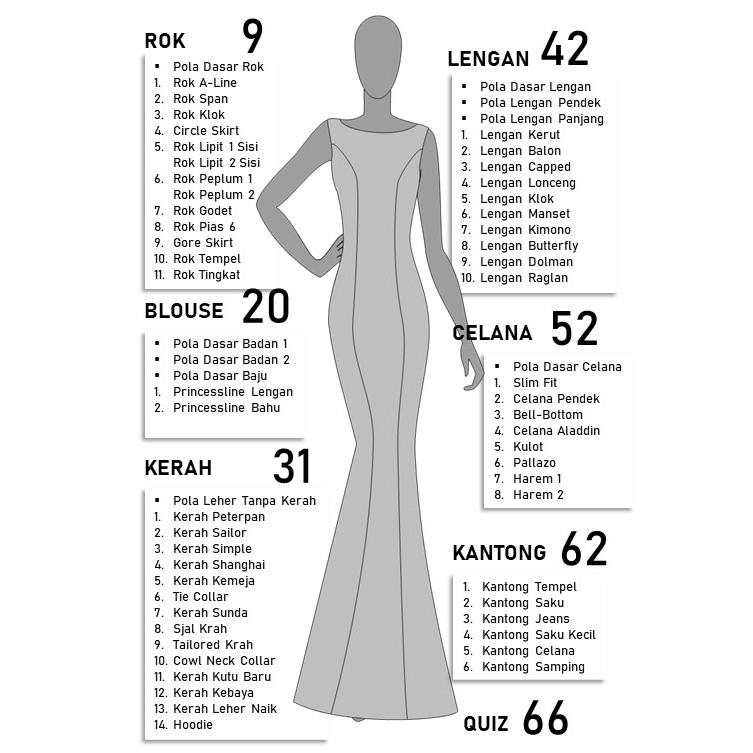 Pola dasar badan muka dan belakang (pola badan bagian atas, dari bahu hingga pinggang) pola dasar rok muka dan belakang (pola badan bagian bawah, dari pinggang hingga lutut atau mata kaki) pola dasar lengan (dari bahu terendah hingga siku atau pergelangan tangan) pola dasar gaun (pola badan atas yang disatukan dengan pola badan bawah).